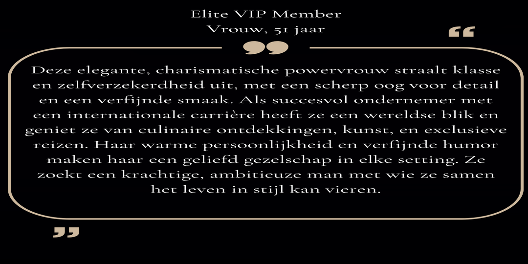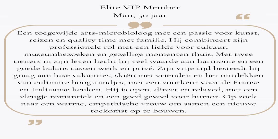 Hierbij zetten we enkele van onze Elite Members in de kijker. Herkent u zich in de persoonsbeschrijving die we voor deze members zoeken? Registreer u dan kosteloos als Gast Member en bezorg ons uw profiel met foto via deze link. U kan rekenen op onze discretie. Bij een mogelijke match nemen we contact op en maakt u kans op een exclusieve date!